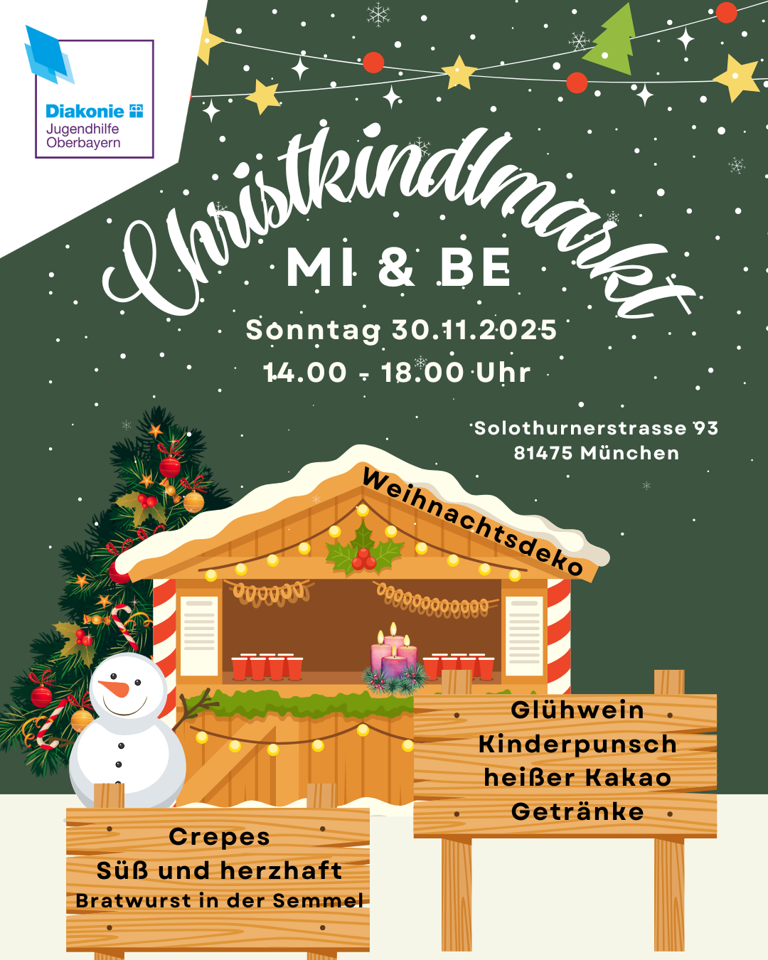 Am 1. Advent – Sonntag, 30. November 2025 – lädt das MI & BE-Team zwischen 14 Uhr und 18 Uhr alle Stadtteilbewohnerinnen und -bewohner zu einem stimmungsvollen Christkindlmarkt ein!