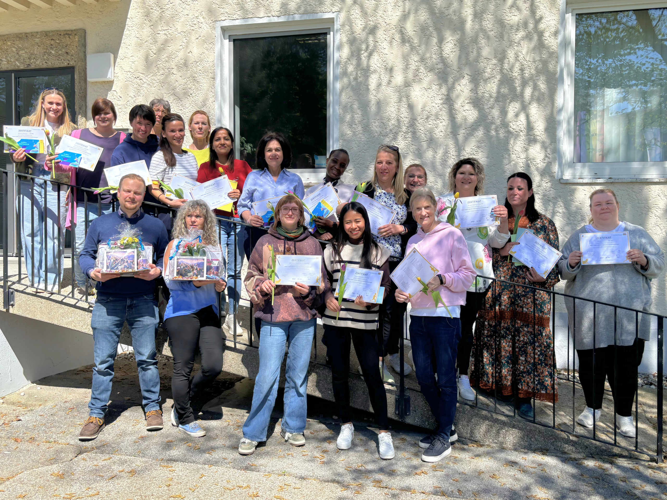 Ein Jahr lernen, reflektieren und direkt in der Praxis anwenden: 19 engagierte Teilnehmende haben ihre berufsbegleitende Weiterbildung zur Ergänzungskraft in bayerischen Kindertageseinrichtungen erfolgreich abgeschlossen. Die Qualifizierung kombiniert Präsenzseminare, Online-Termine und Selbstlernphasen im Blended-Learning-Format. So können die Teilnehmenden das Gelernte unmittelbar in ihrem Arbeitsalltag erproben und im Kurs gemeinsam weiterentwickeln.